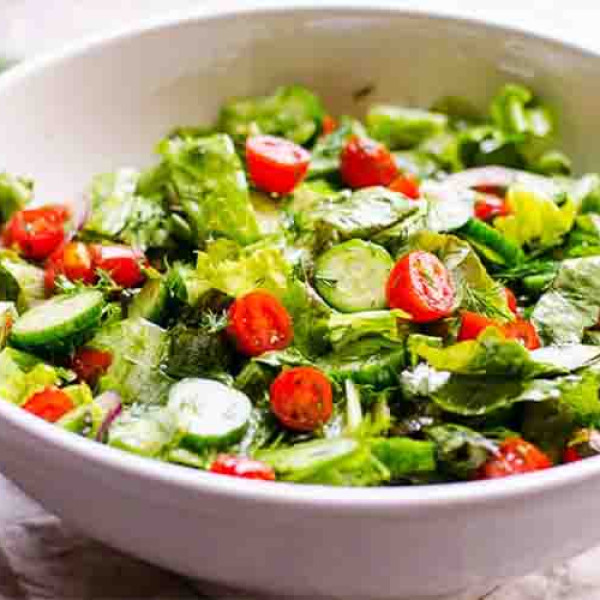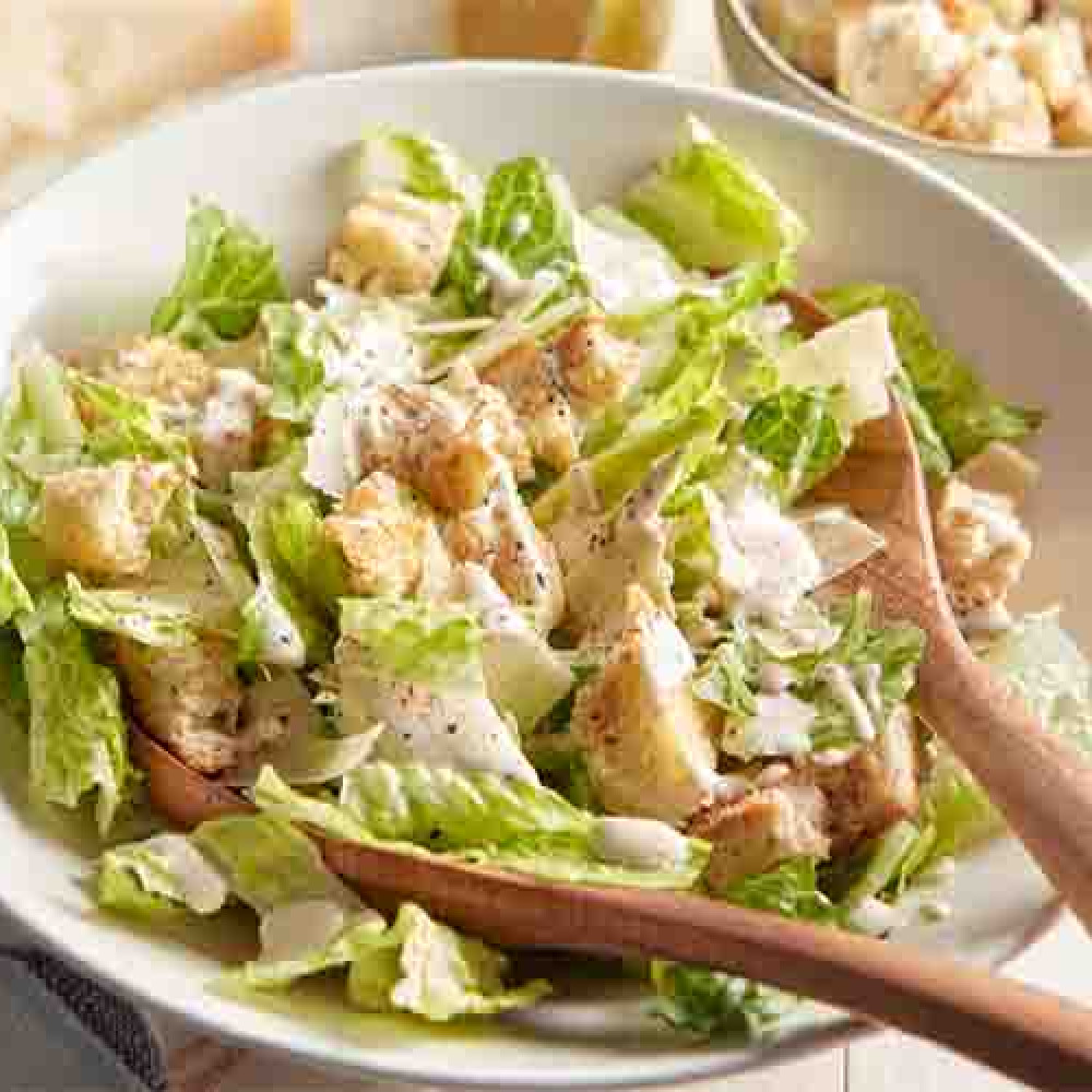 Crisp romaine lettuce tossed in creamy garlic Caesar dressing, topped with freshly grated parmesan and crunchy homemade croutons. A classic, flavorful salad perfect for any meal.