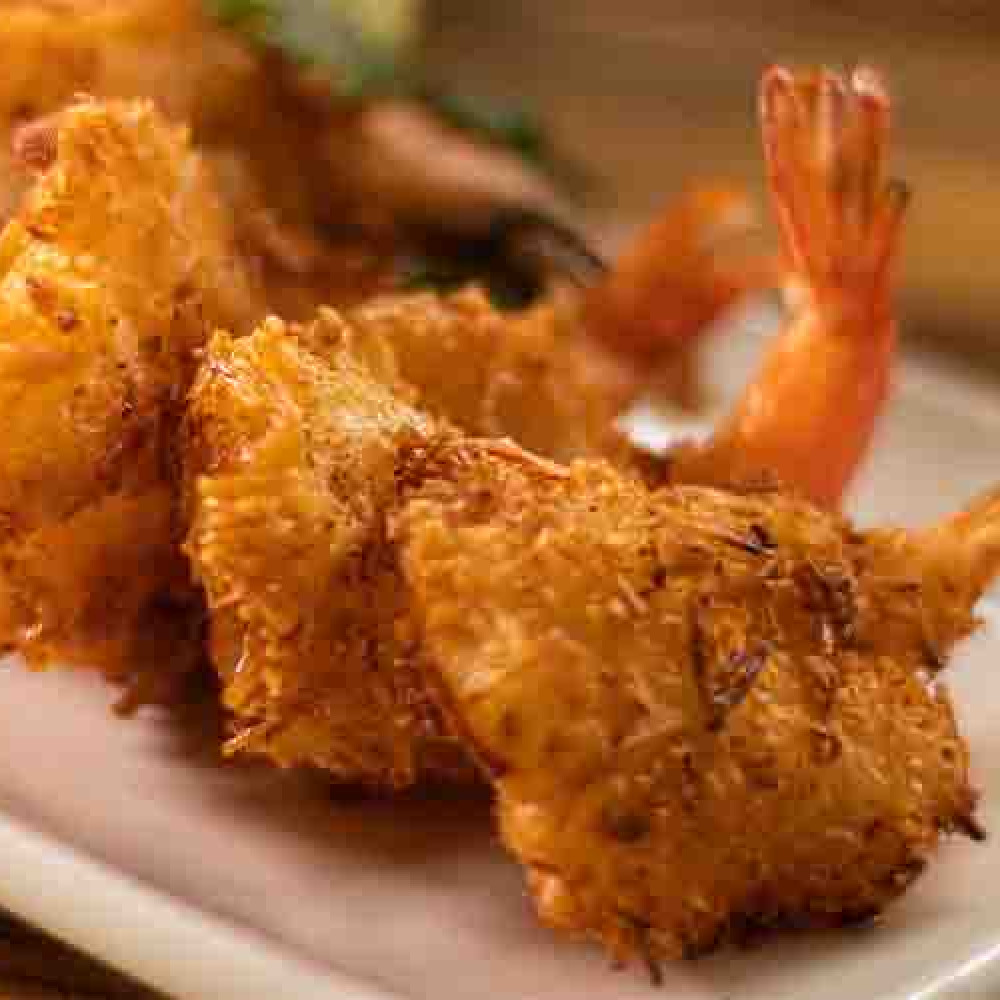 Crispy coconut shrimp, marinated and coated in shredded coconut, then deep-fried to golden perfection. Served with a flavorful curried chutney sauce. Includes 4 pieces. A tropical delight!