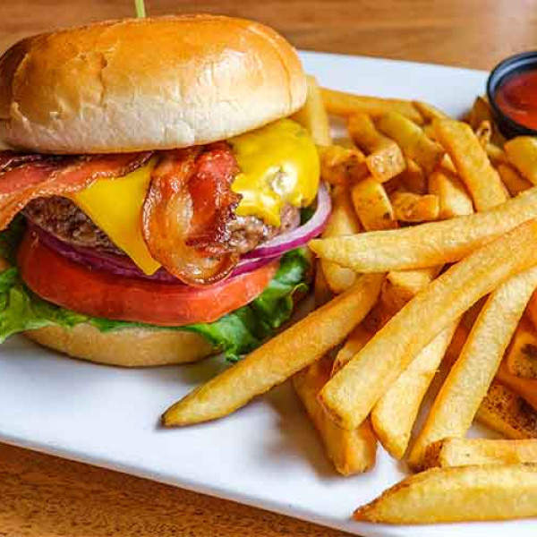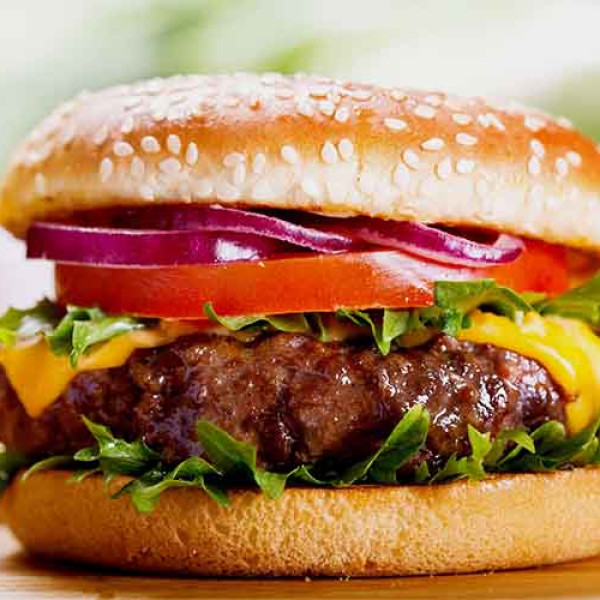 Juicy beef patty, fresh lettuce, tomatoes, onions, melted cheese, and savory sauce in a toasted bun—delicious, satisfying, and full of flavor!