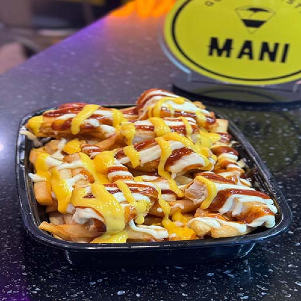 Crispy fried chicken patty paired with golden fries, topped with smoky BBQ sauce and rich cheddar sauce for a satisfying bite.