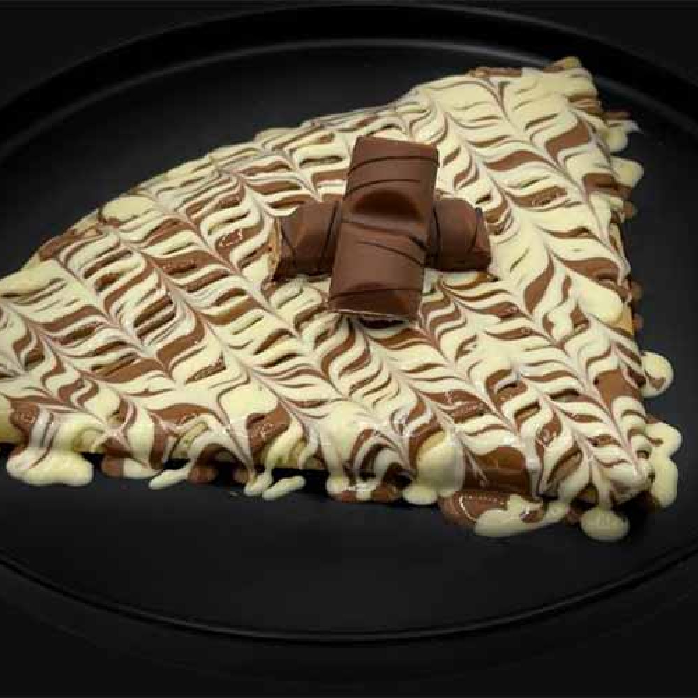 Warm crepe filled with creamy Kinder chocolate, lightly dusted with sugar, folded golden, indulgent, smooth, sweet, and irresistible dessert favorite.